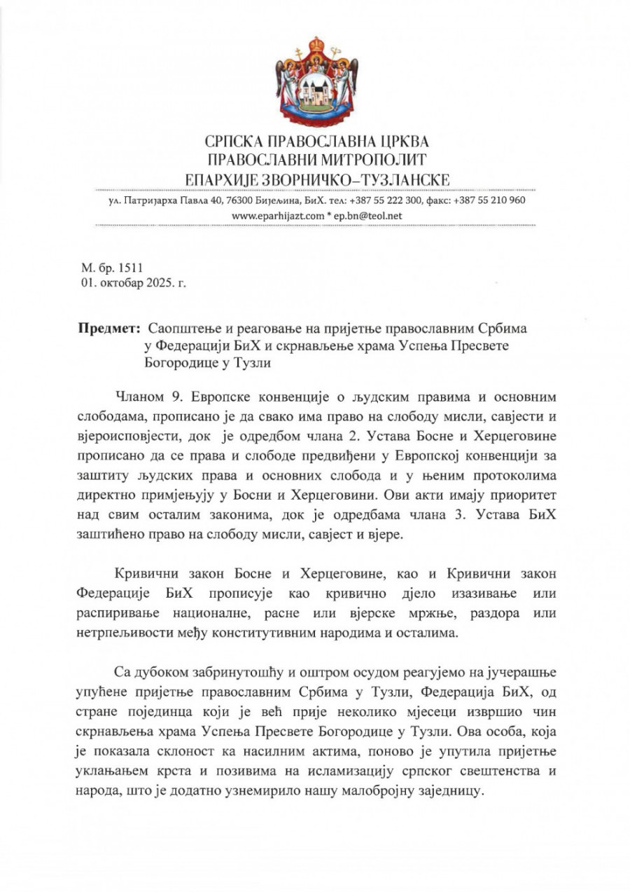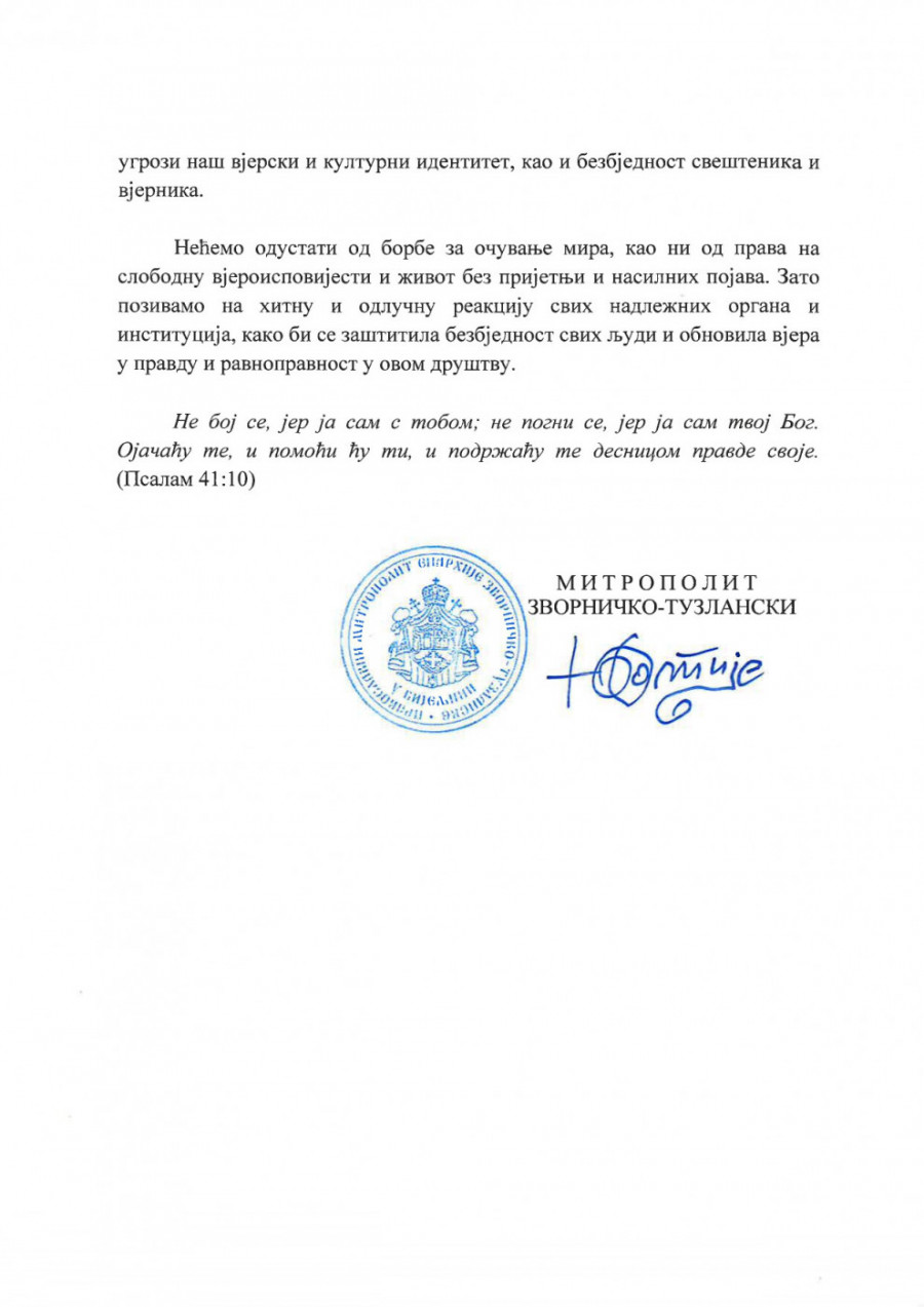 – Ova pretnja nije izolovan incident, već je izvesno vreme deo kontinuiranog procesa napada na pravoslavnu zajednicu u Federaciji BiH. U poslednjem periodu učestali su napadi i na domove sveštenika u Tuzli, pri čemu su razbijani prozori na kući u kojoj živi naš sveštenik. Ovi napadi nisu samo vandalski, već predstavljaju ozbiljnu pretnju bezbednosti sveštenika i njihovih porodica, kao i šire ugrožavanje mira i sigurnosti u našoj zajednici – istakao je vladika.
