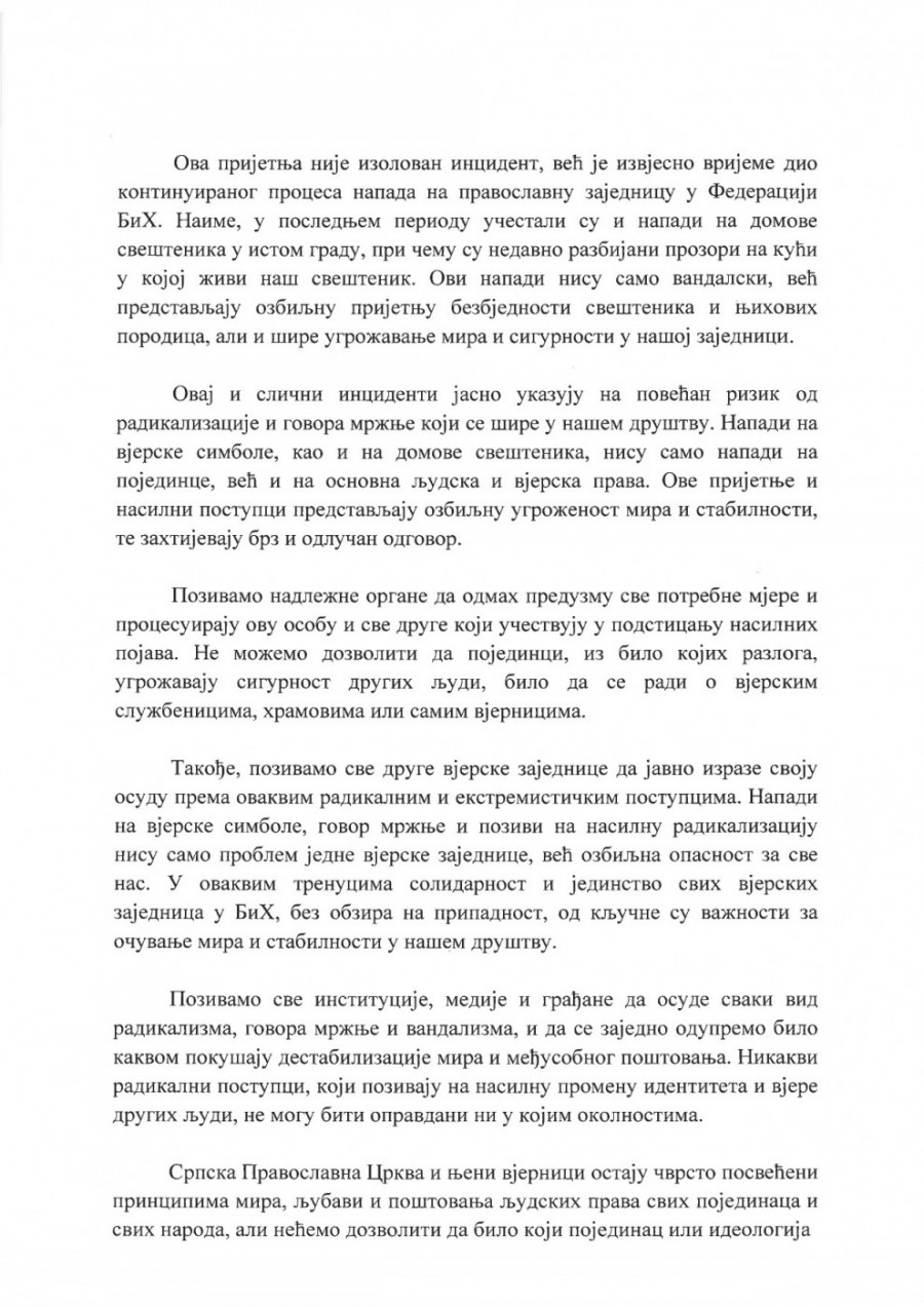 – Pozivamo sve verske zajednice da javno osude ovakve radikalne i ekstremističke postupke. Napadi na verske simbole i pozivi na nasilnu radikalizaciju nisu samo problem jedne verske zajednice, već ozbiljna opasnost za sve nas. U ovakvim trenucima solidarnost i jedinstvo svih verskih zajednica u BiH od ključne su važnosti za očuvanje mira i stabilnosti.