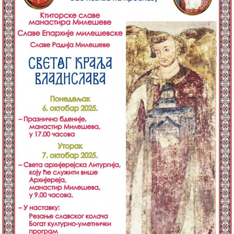 Centralno bogoslužbeno sabranje zakazano je za utorak, 7. oktobar, kada će u 9 časova u manastiru Mileševa biti služena arhijerejska liturgija. Nakon svetog bogosluženja, sledi rezanje slavskog kolača u znak zajedničke molitve i zahvalnosti Svetom kralju Vladislavu.