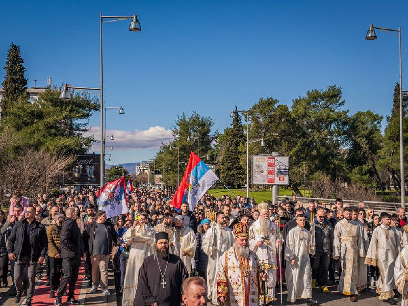 Po završetku Liturgije, arhijereji, sveštenstvo, monaštvo i više hiljada vernika – roditelja i dece – krenuli su u tradicionalni krsni hod od Sabornog hrama do Nemanjinog grada. Ikone su nošene visoko, barjaci su se lagano povijali, a molitveni poj stapao se sa koracima naroda koji je hodio istim putem kojim su, simbolično, hodile generacije pre njih.