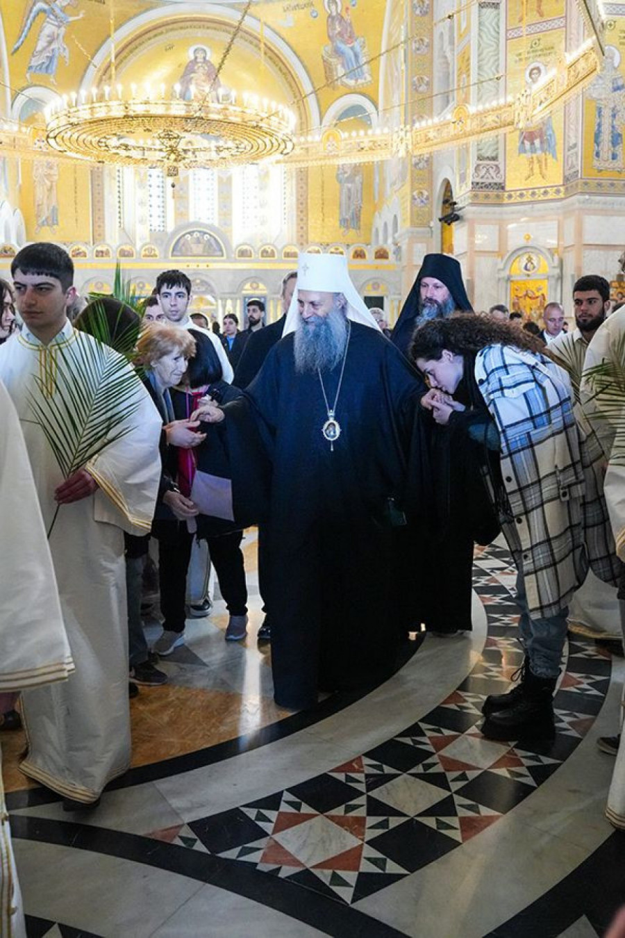 – Evo, praćen mnoštvom ljudi, Gospod ide u sveti grad Jerusalim i to ide na magaretu, hoteći da pokaže da Njegovo carstvo nije odavde, nego da je to carstvo Božje, da je carstvo Njegovo carstvo odozgo i ono silazi među nas da bismo mi mogli da postanemo građani i žitelji tog carstva. Silazi među nas tako što je Gospod postao sve što mi jesmo, poistovetio se sa nama u svemu i po svemu, osim u grehu. Stoga ide u Jerusalim da se sa nama poistoveti i u smrti, da bi tu smrt razorio, da bi uništio najvećeg i poslednjeg našeg neprijatelja, da bi nam darovao život večni, zagrlivši nas i čineći da mi budemo deo Njegovog tela, deo Njegove Crkve, čineći nas da budemo deo Njegovog Carstva – rekao je patrijarh.