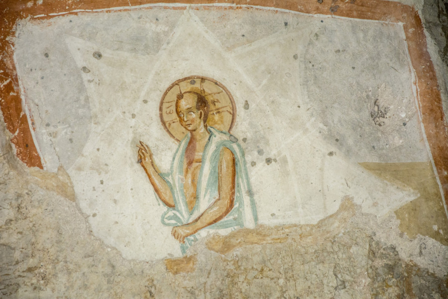 Poznata pod imenom Isus Mladenac, freska se nalazi na severnom zidu crkve i predstavlja jedini živopis unutar ove pećinske svetinje. Ono što zapanjuje posetioce i intrigira istoričare umetnosti jeste prikaz Isusa: mlad, bez kose, u odeždi koja neodoljivo podseća na budističku, okružen svetlosnom osmougaonom mandorlom ili zvezdom.