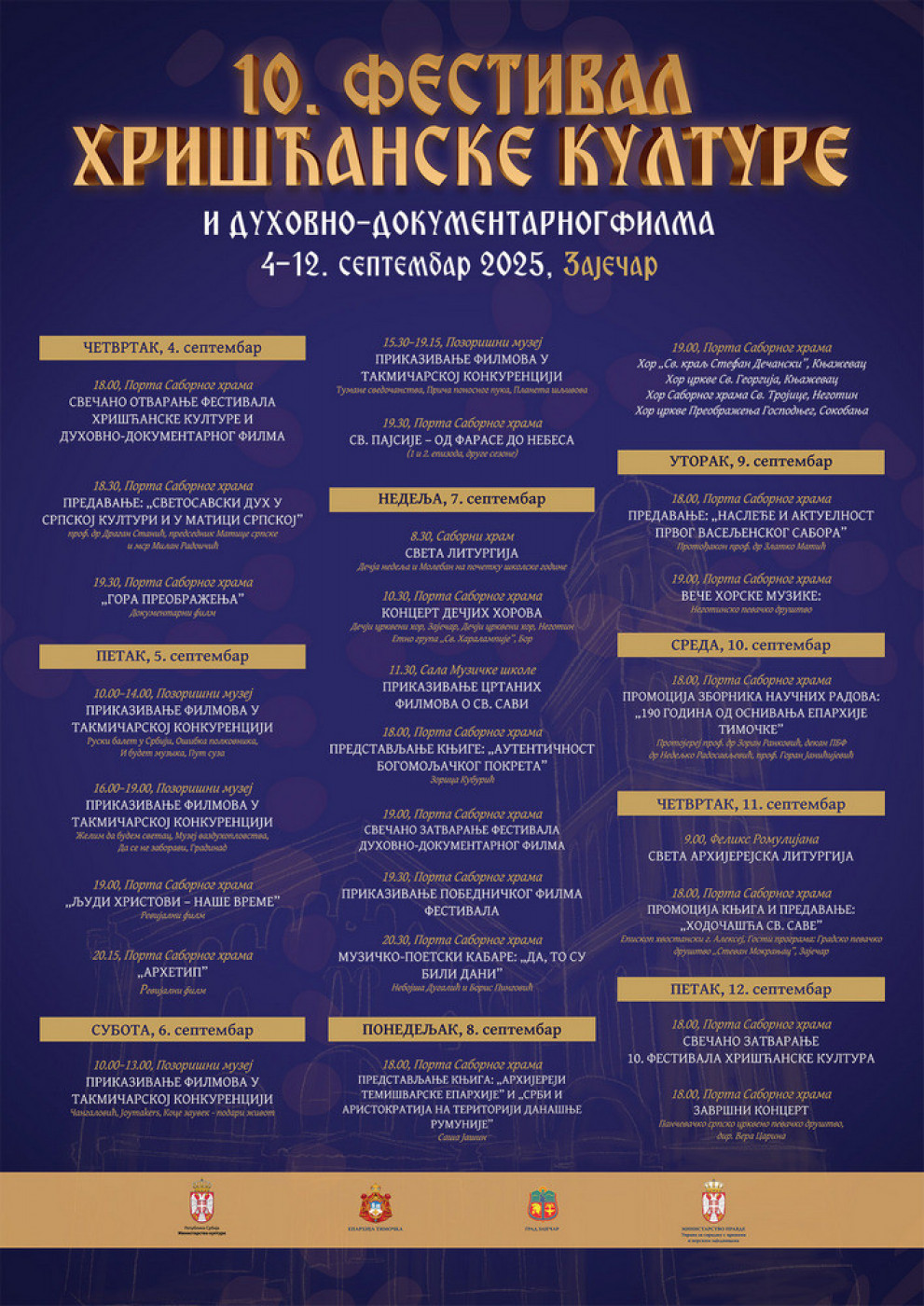"Sa posebnom radošću najavljujemo održavanje 10. jubilarnog Festivala hrišćanske kulture i duhovno-dokumentarnog filma u Zaječaru, koji ove godine protiče u znaku velikog jubileja - 850 godina od rođenja Svetog Save, prvog arhiepiskopa srpskog, prosvetitelja i duhovnog utemeljivača srpskog naroda.