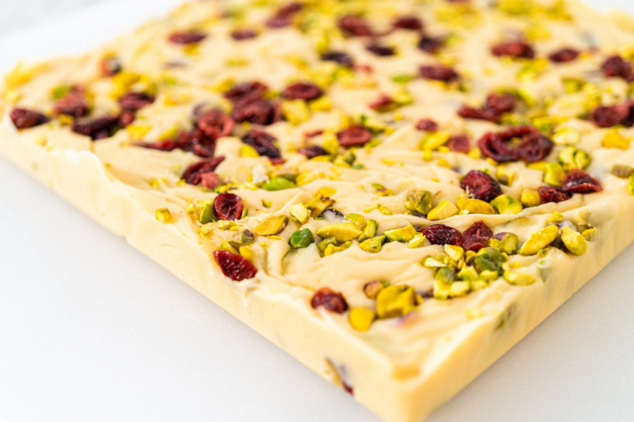 Pistaće i keks grubo izblendajte, a zatim ih sjedinite u posudi sa suvim brusnicama i belom čokoladom koju ste prethodno istopili sa slatkom pavlakom. Rukama oblikujte smesu i utisnite je u tepsiju obloženu papirom za pečenje, pa je pokrijte i ostavite u frižideru na kratko da se lepo stegne. Kada je podloga spremna, prelijte je preostalom belom čokoladom i vratite u frižider još nekoliko minuta dok se ne učvrsti. Na kraju dekorativno pospite seckanim pistaćima, dodatnom čokoladom i nežnim laticama ruže, potom isecite na kocke i poslužite, a svaki zalogaj neka donese toplinu i radost na slavsku trpezu.
