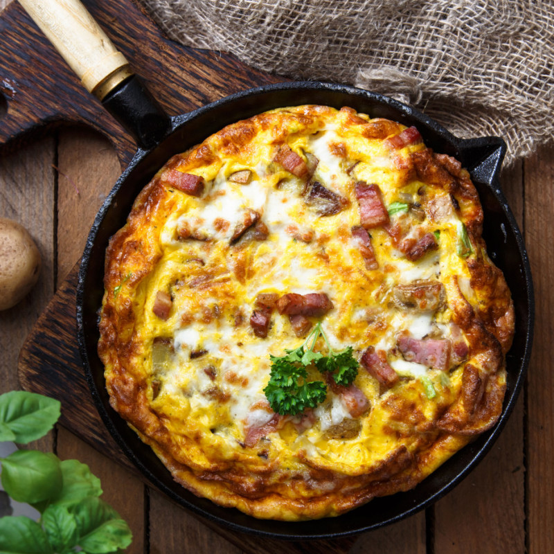 U međuvremenu, u posebnoj posudi umutite jaja, pavlaku za kuvanje, so, biber i malo belog luka u prahu. Paradajz, mladi luk i šunku (ili slaninu) sitno iseckajte, a preostali sir narendajte. Sve ove sastojke dodajte u smesu od jaja i dobro sjedinite.