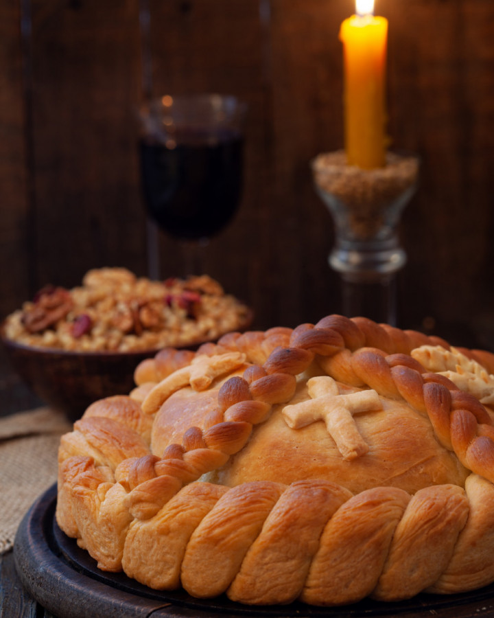 Ostavite kolač da odmori još oko 30 minuta, zatim ga premažite osvećenom vodom i ukrasite po tradiciji – može se napraviti krst od testa ili ukrasi koji simbolizuju porodicu i veru. Pecite kolač u prethodno zagrejanoj rerni na 200°C oko 45–50 minuta, ili dok ne dobije zlatno-braon boju. Kolač je gotov kada čačkalica koju zabodete u sredinu izađe čista.