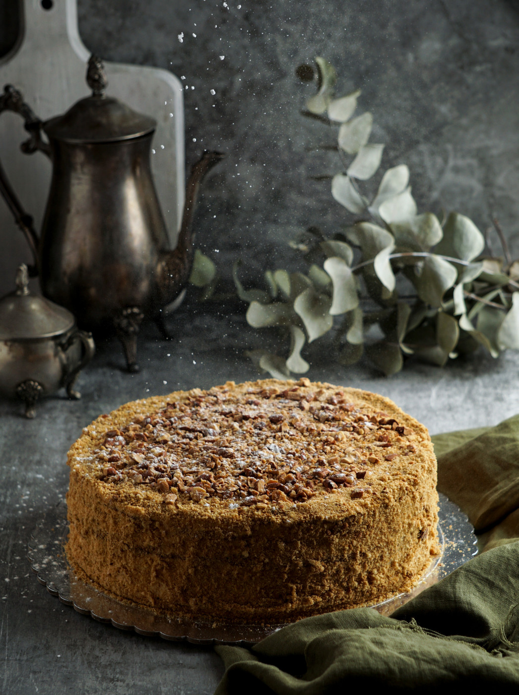 Svaku koru pažljivo premažite pripremljenim nadevom, slažući ih jednu na drugu, a zatim celu tortu obložite istim filom i pospite seckanim orasima, da se svi ukusi prožmu i daruju ovoj poslastici toplinu domaće trpeze.